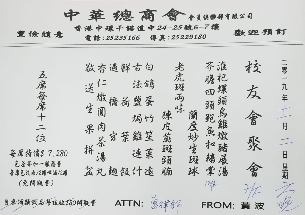 “It was unfortunate that a few of our Old Boys and Guests were unable to make it to our Dinner Celebration tonight due to the trouble on HK streets,” James Wong Hong Kun 黄漢根, our chief organizer, said on WhatsApp. “I am happy to report that our excitement on the 8th floor outlasted the troubles on the streets below. Everyone had a safe trip home after the excitement from our 50th Anniversary Dinner Celebration.”