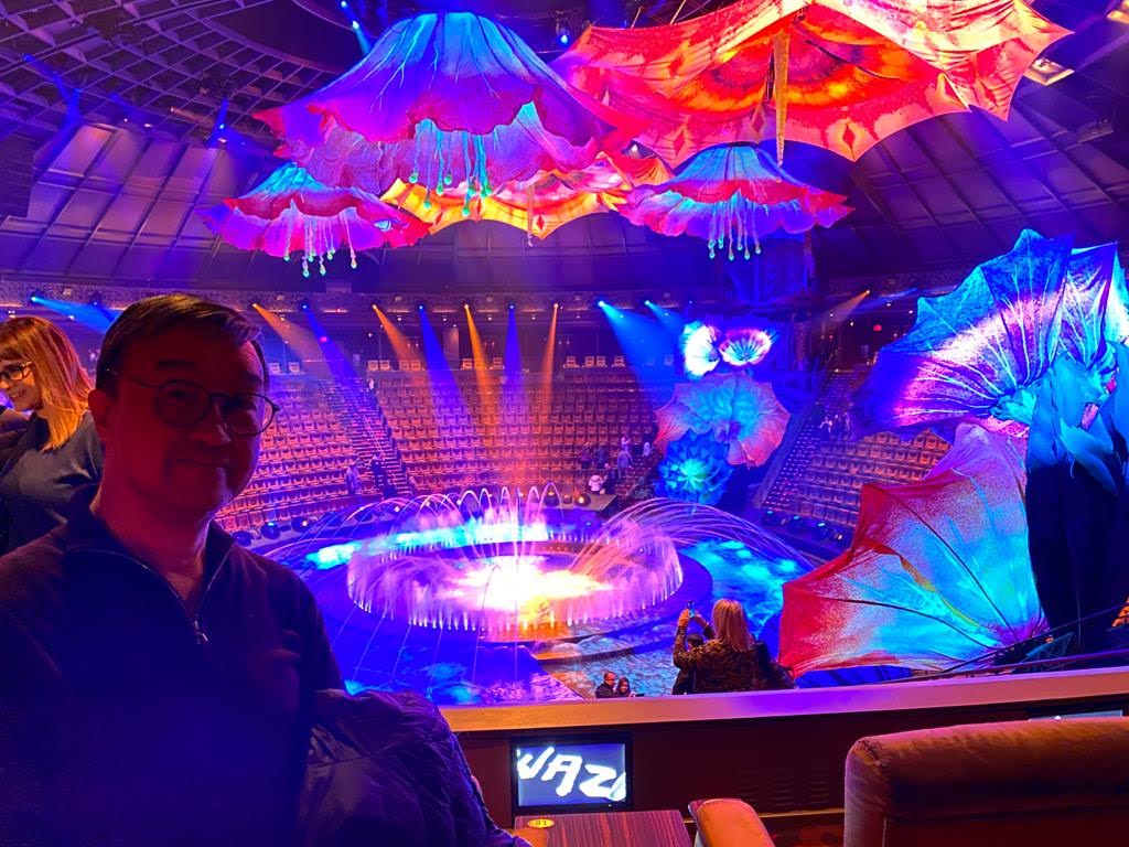 When we entered the Wynn Theater, we saw a large water pool in the stage center, 80 feet above it was an opening with a huge lit globe, and the audience sat in circles around the stage.