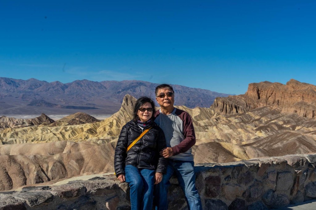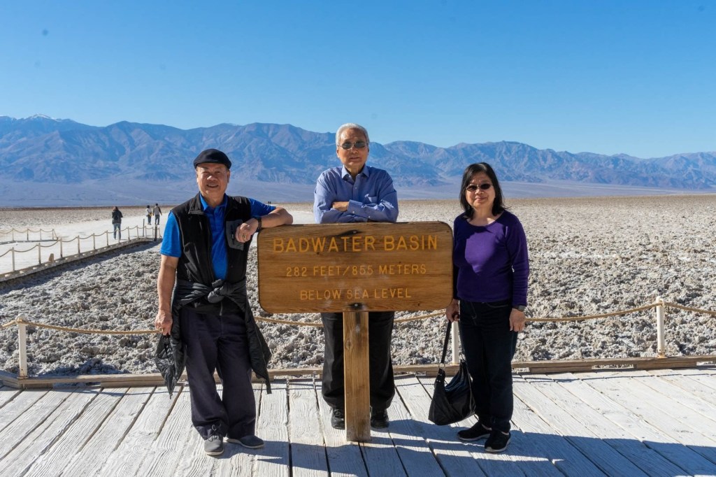 We regrouped at the Furnace Creek Visitor Center five miles north to decide on the vantage points, only to learn that one of our major points that day, Dante’s View, is closed for railings repairs. At the suggestion of the park ranger, we decided on Badwater Basin and the Mesquite Flat Sand Dunes instead.