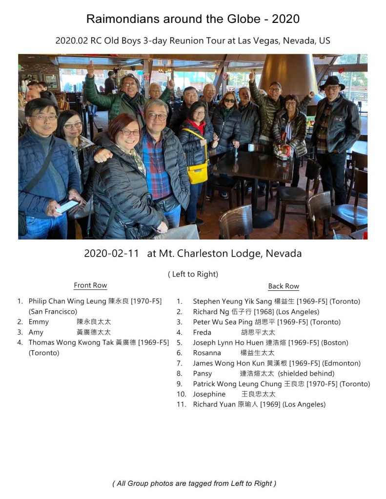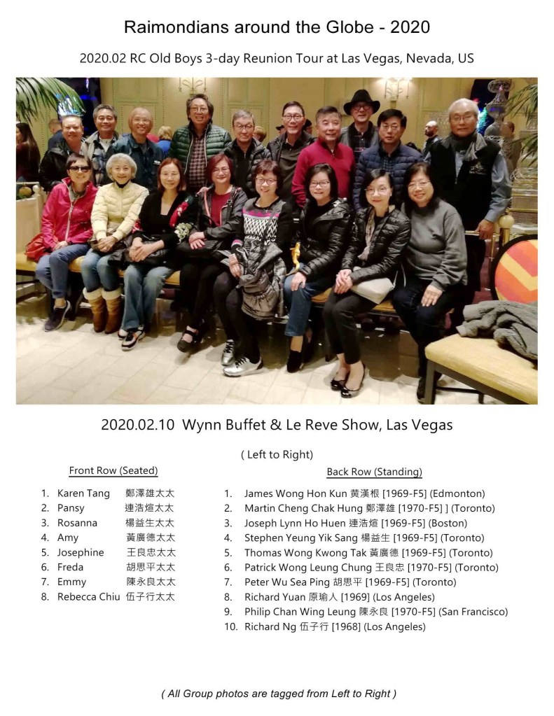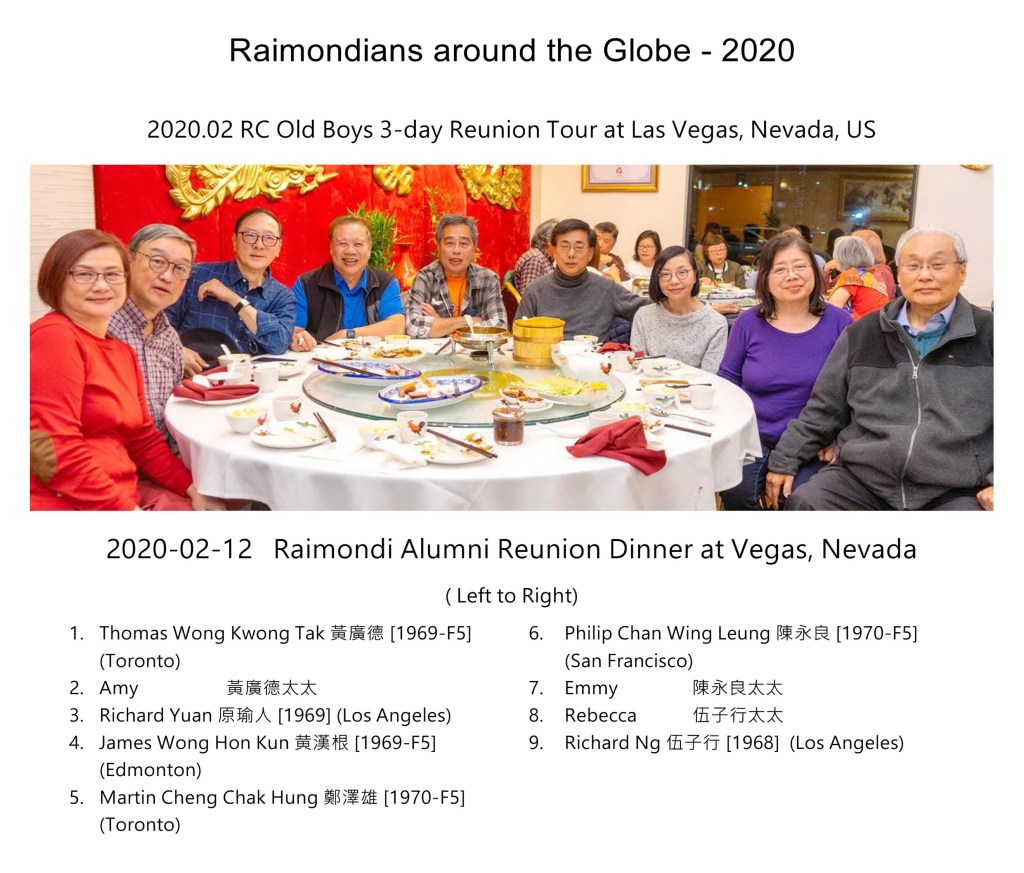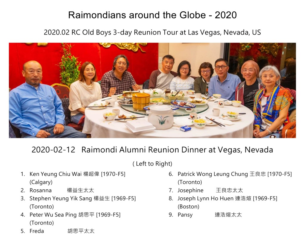 The Raimondi Class of ’69 alumni had a most successful 50th Anniversary celebration held in Toronto on July 7, 2019. The Toronto old boys felt very excited about the reunion, and they thought that as the largest number of alumni was in Toronto, maybe they could extend the fellowship to former schoolmates in other cities as well. There was a number of alumni on the West Coast, so Peter Wu 胡思平 (’69) suggested a gathering in Las Vegas after the Chinese New Year, considering that Las Vegas is an attractive tourist place with many sights to see.