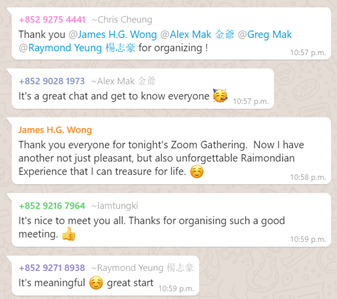 The getting-to-know-you pilot session was attended by about two dozen Raimondians who logged in across many time zones from a long list of cities including Sydney, London, Los Angeles, San Francisco, Boston, New York, Philadelphia, Vancouver, Edmonton, Toronto – in addition to Hong Kong.
